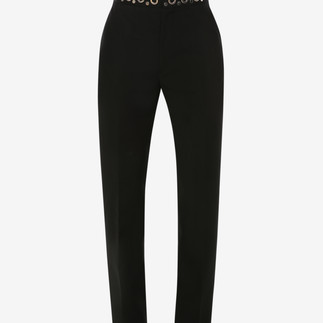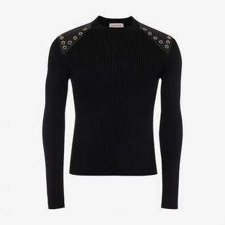 A crew neck rib knit jumper with slashed elbows and silver eyelet harness detailing on black leather and high-waisted one-pleat wide-legged trousers in black gabardine.