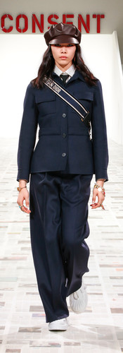 The show venue was designed in collaboration with the Claire Fontaine collective, which has exhibited at the National Gallery of Modern and Contemporary Art in Rome. The museum is also home to the archives of Carla Lonzi, a charismatic figure who was an art critic before committing to the feminist cause. “Io Dico Io – I Say I ****”, the title of an upcoming exhibition dedicated to Italian women artists, supported by Dior, becomes the starting point for a series of manifesto-like phrases. Evoking these words in English – “I say I” – right at the show’s entrance brings to life a story of powerful self-assertion. They are the symbol of a joyful singularity, as well as a creative and collective way of approaching the multiple aspects of feminine subjectivity — and the infinite project that femininity represents.