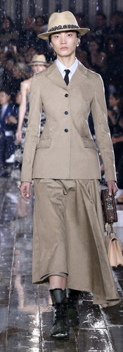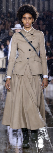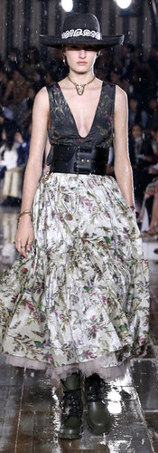 Ample and extravagant skirts are worn with tted jackets that accentuate the narrowness of the waist, emphasized with a high belt. The collection is punctuated with different materials, such as that great French classic that is toile de Jouy, which has been revisited and modernized, its picturesque scenes featuring the introduction of a series of wild animals, including tigers and serpents. Lace, whether light or opulent, layered in pleated ounces or perfectly rounded, is set off by black rubber boots that contrast with the more contemporary elements: transformed tulle skirts and Bar jackets possess an assertive air. The tulle blooms a powerful red as well as in superimposed powdery shades.