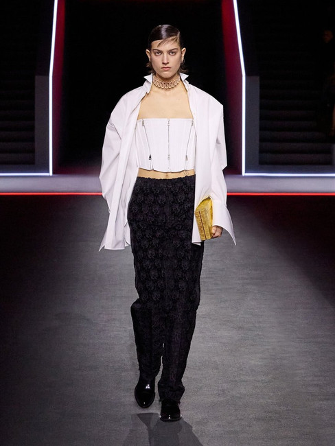 The collection revisits elements from the house’s history while introducing a contemporary perspective. Chiuri places the white shirt at the center of the wardrobe, referencing the work of Gianfranco Ferré and framing it as a foundation free from gender constraints.