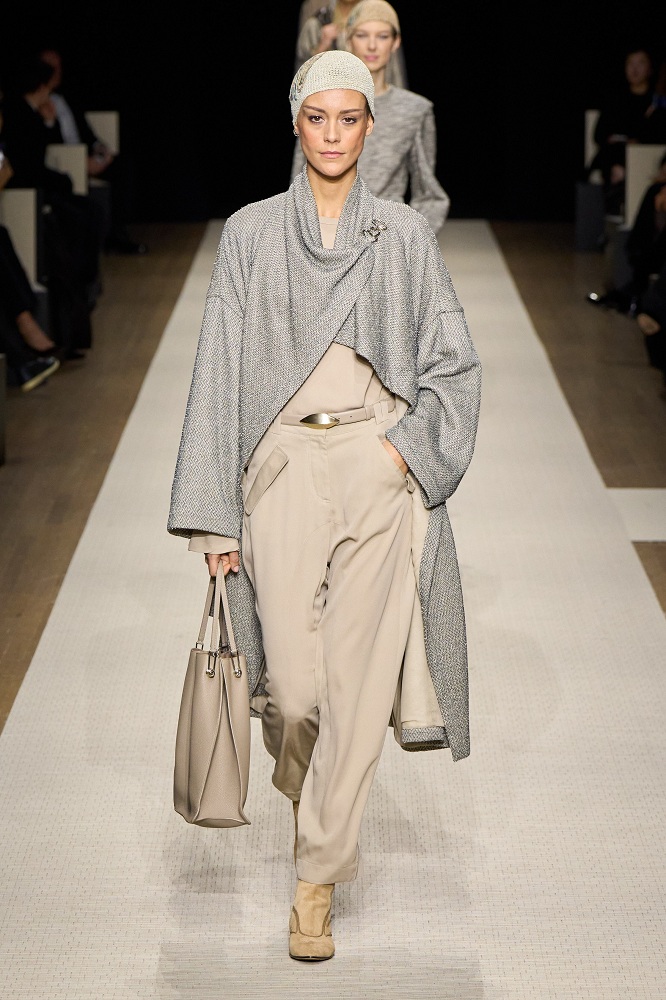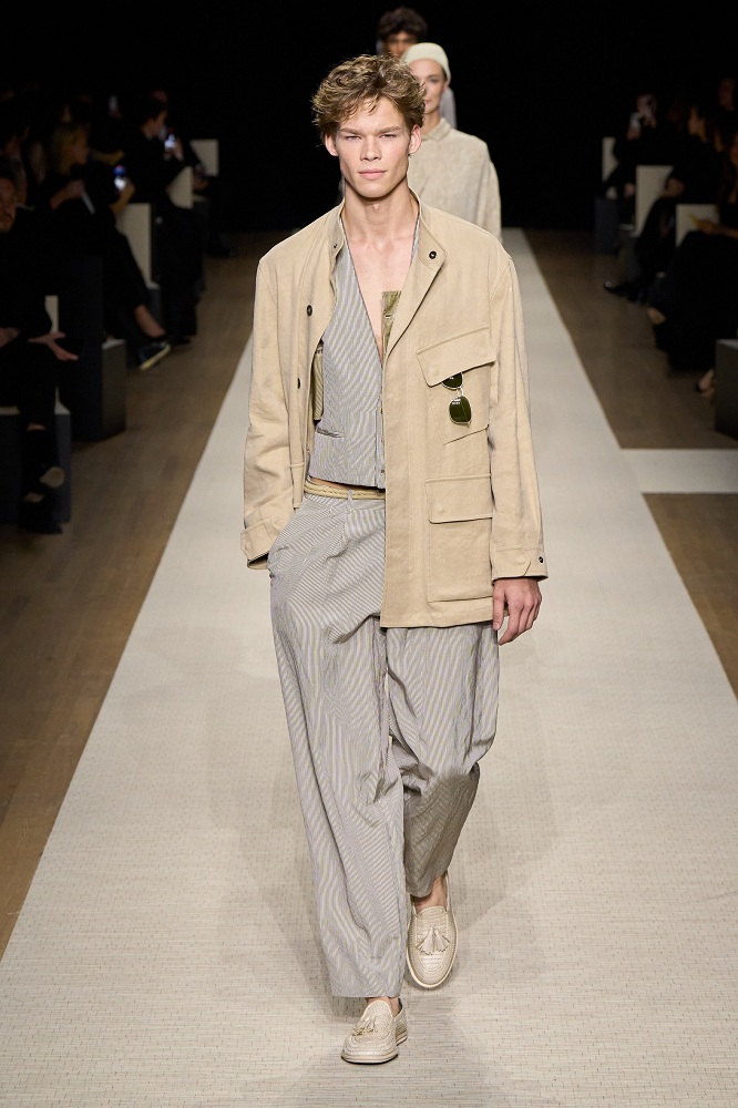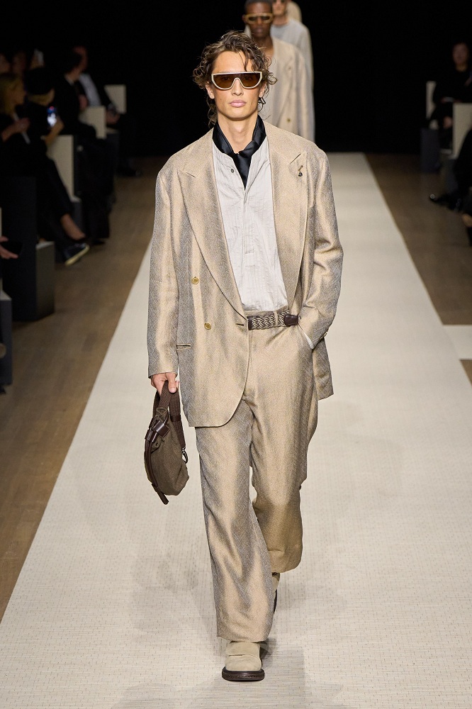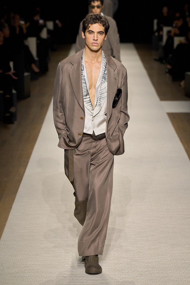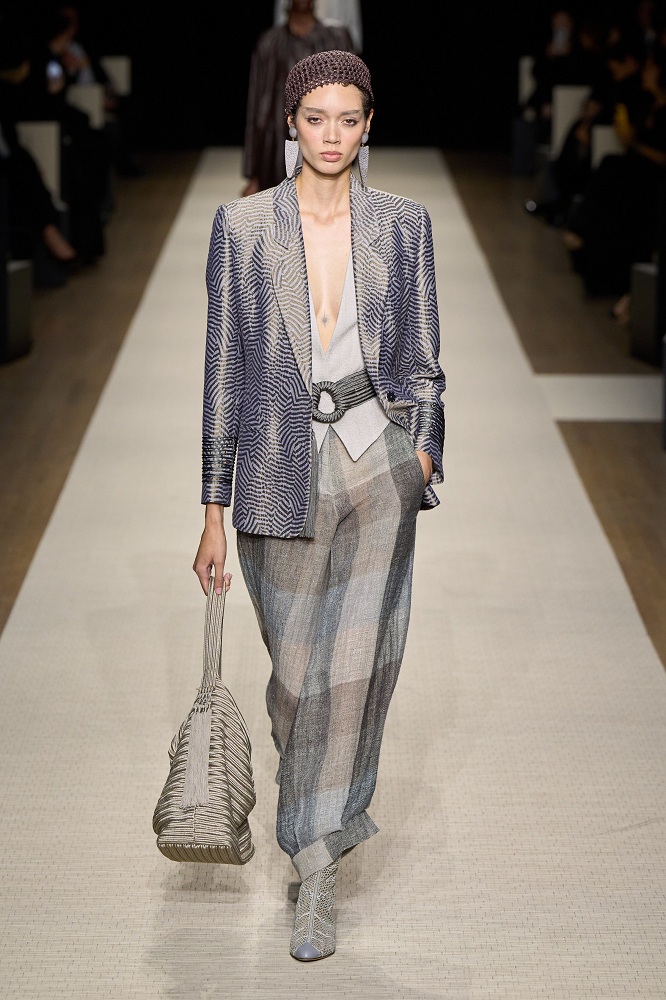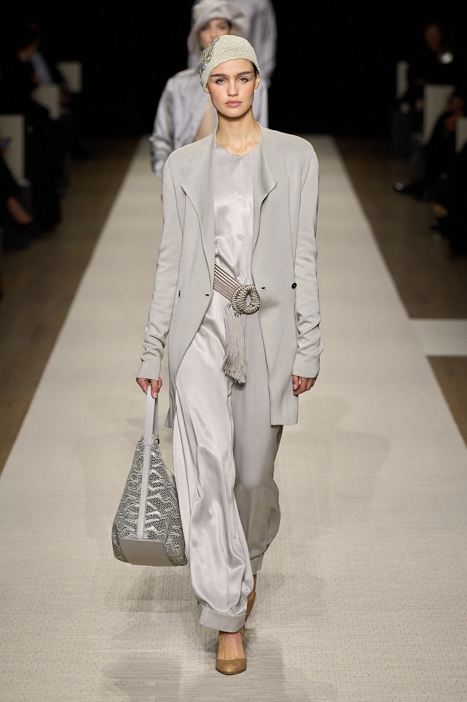 Tailored blazers, wide-leg trousers, and flowing dresses transition seamlessly from day to night, embodying Armani’s timeless aesthetic. Delicate pleating, subtle embroidery, and refined draping add depth to the collection’s understated elegance.