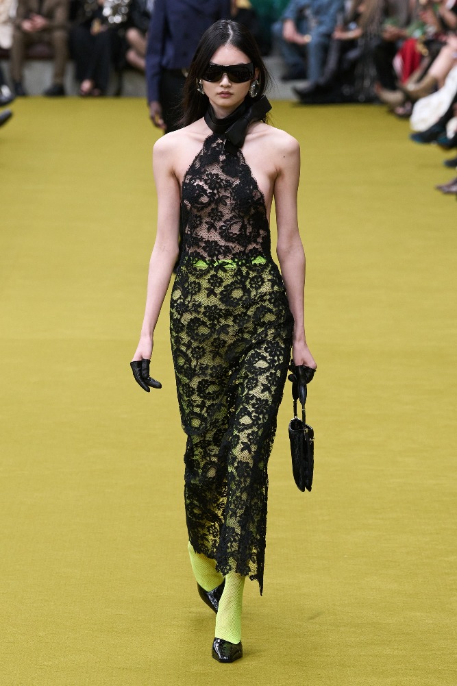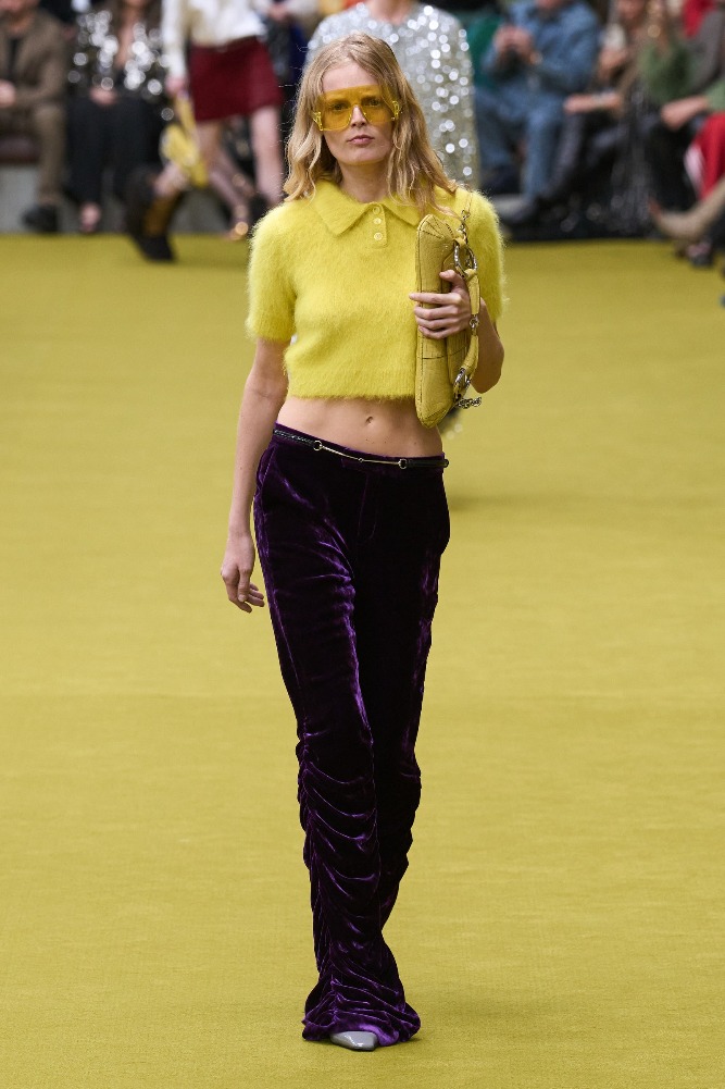 The collection featured a mix of Tom Ford’s slimline tailoring and Michele’s eccentric stylings, with heart-shaped faux-fur collars, panniers, crystal-trimmed portholes, sequined slip dresses, faux-fur chubbies, boyfriend jeans, button-downs, oversized double-G buckles, and revived horse-bit handbags. The vintage cast included Guinevere Van Seenus and Liisa Winkler, who walked the Tom Ford runway in the ‘90s. The future of Gucci’s creative legacy remains to be seen with De Sarno’s upcoming debut.