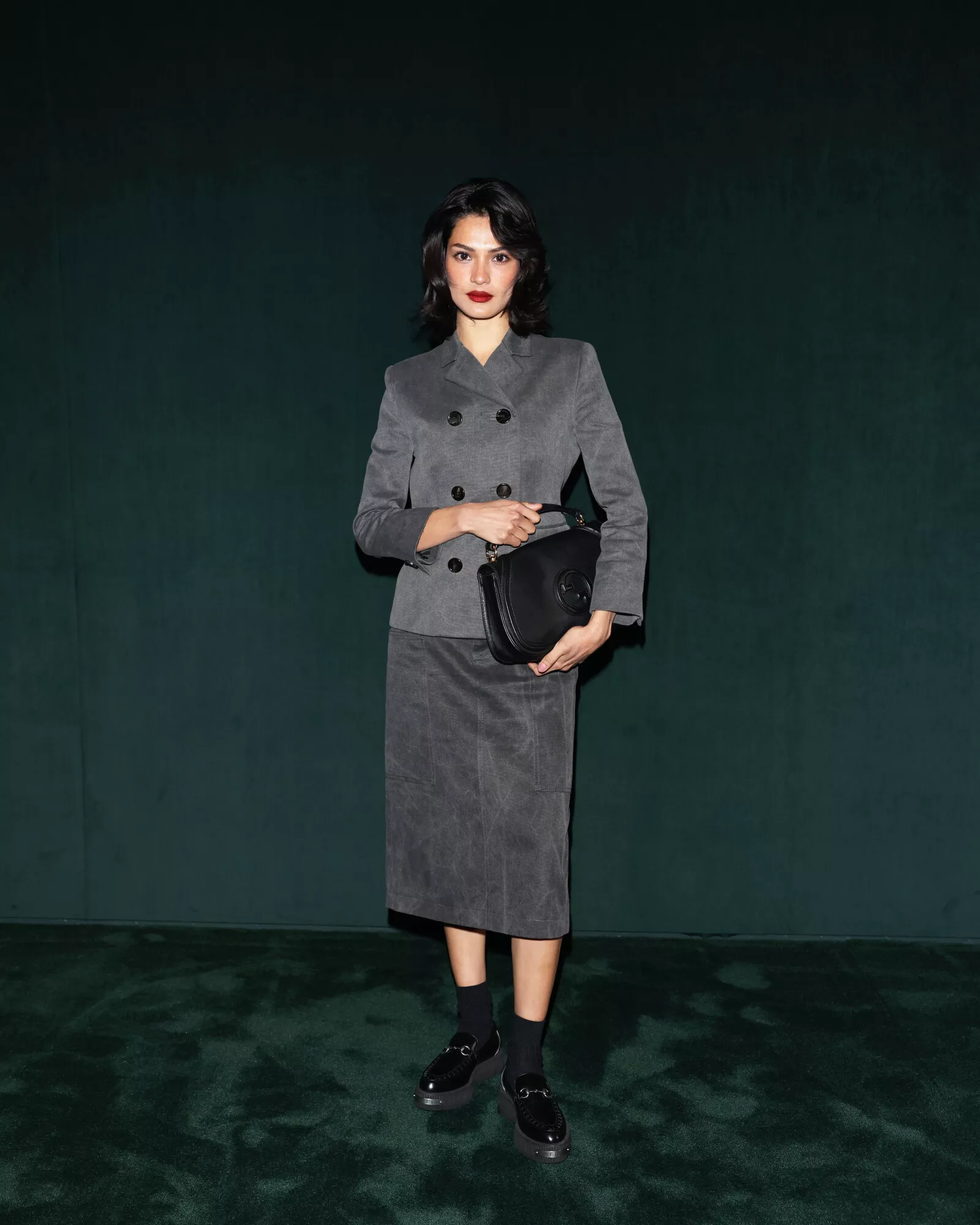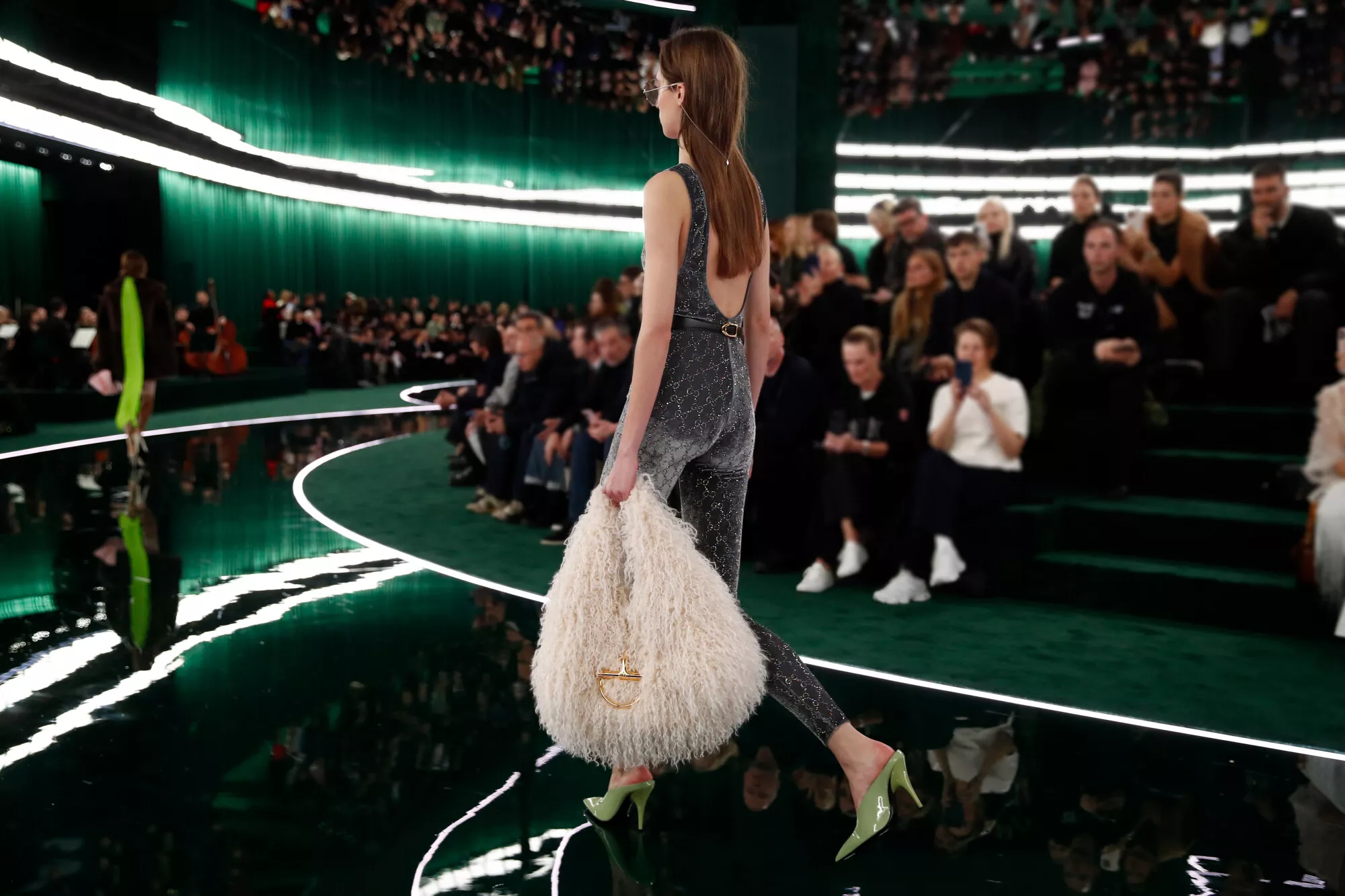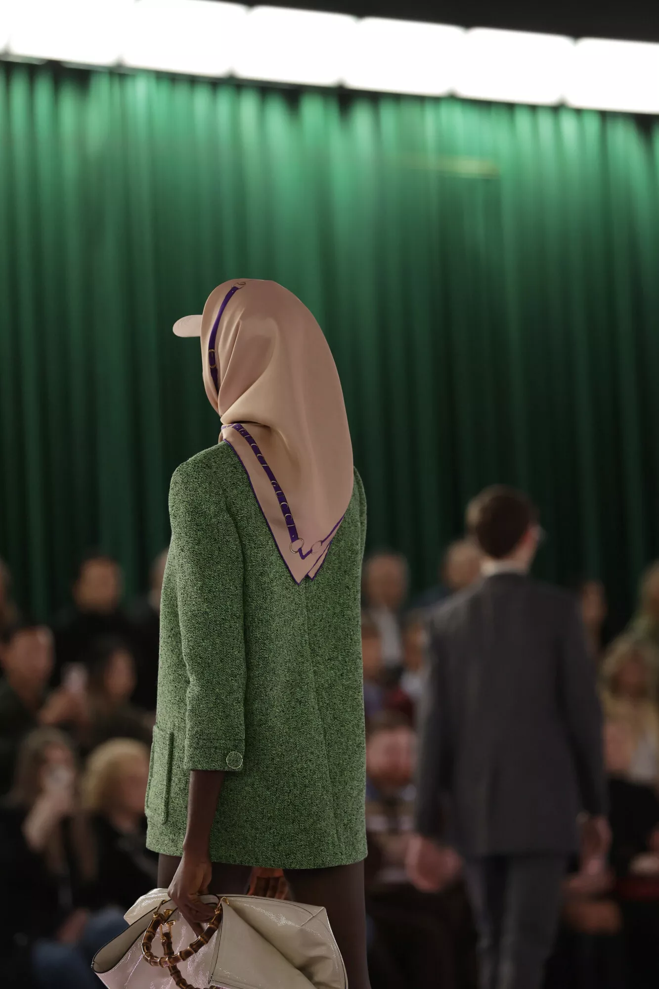 Walking along the entwined dark green Interlocking G of the catwalk – standing for the founder, Guccio Gucci, the emblem celebrates its fiftieth anniversary this year – the duality of men’s and women’s shows becomes a synergy and a whole. Like a double helix, yin and yang, or the lemniscate of infinity, each defines the other. Here, sartorial strictness is placed against playfulness, men’s tailoring fabrics traverse the entirety of the collection, transposed into the women’s world. Sharpness and delineation are embraced in suiting, yet at times are undercut by a flash of flesh, a volt of color, or the subversion of crepe de chine – here slubbed tweeds, a classic British men’s tailoring motif, are mirrored in the patterns found in sinuous crepe shirting and blouses. A dialogue of hard and soft continues in brushed mohair shirting, mother-of-pearl leathers, coated wools and bonded boucles – fabric experimentation abounds, embracing classicism and subversion. Color harmonies unite both womenswear and menswear in gradations of greens, greys, mauves and browns.