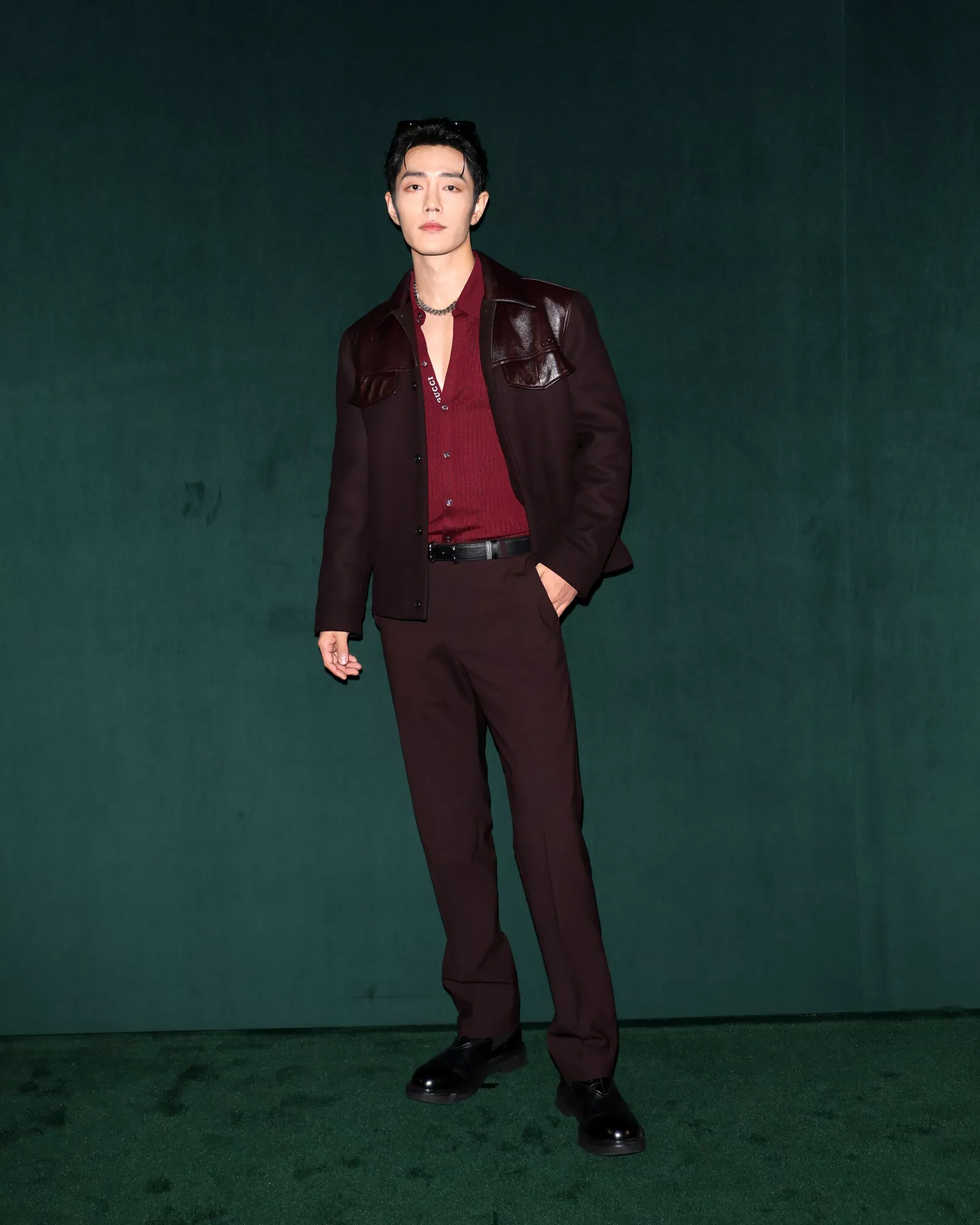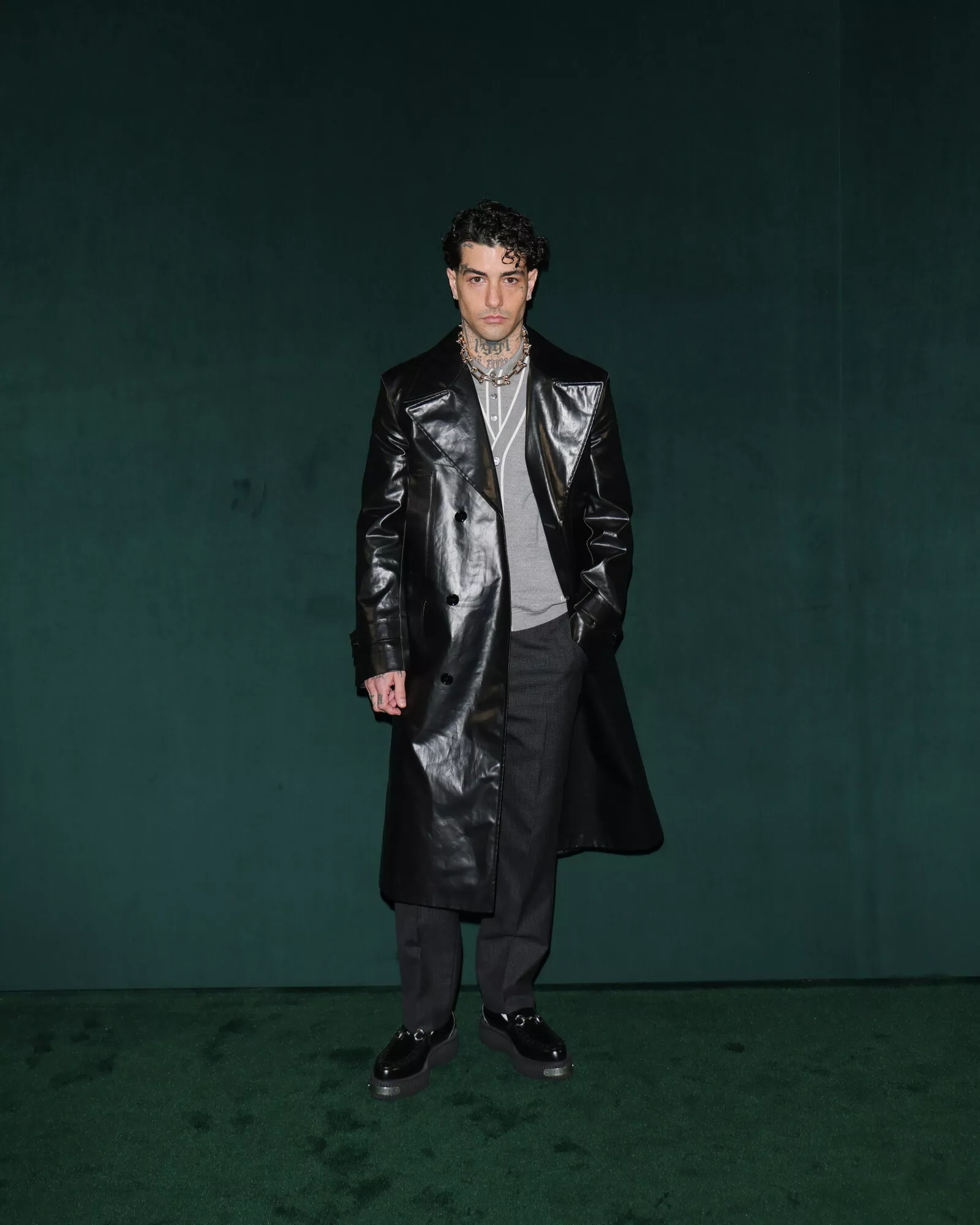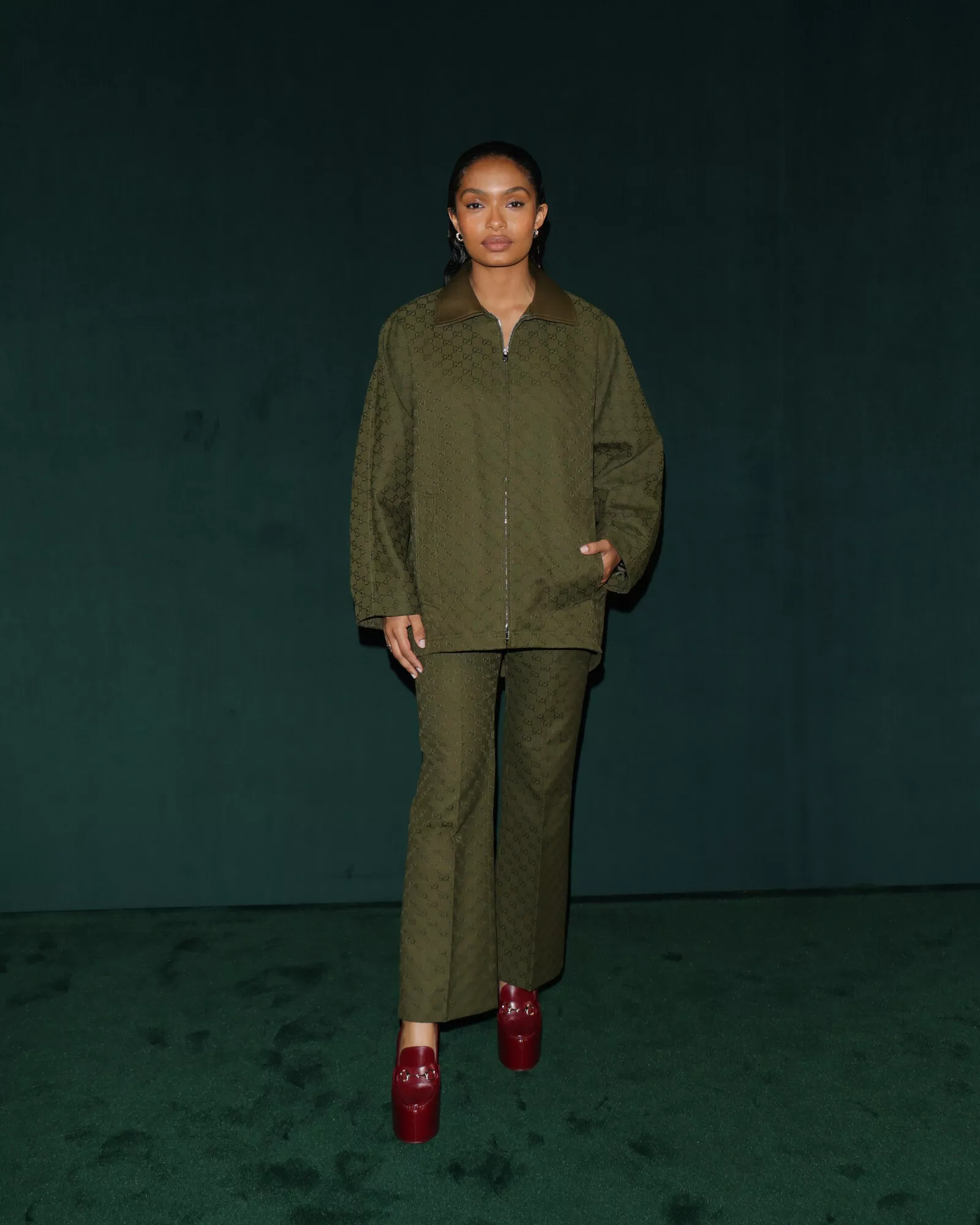 Walking along the entwined dark green Interlocking G of the catwalk – standing for the founder, Guccio Gucci, the emblem celebrates its fiftieth anniversary this year – the duality of men’s and women’s shows becomes a synergy and a whole. Like a double helix, yin and yang, or the lemniscate of infinity, each defines the other. Here, sartorial strictness is placed against playfulness, men’s tailoring fabrics traverse the entirety of the collection, transposed into the women’s world. Sharpness and delineation are embraced in suiting, yet at times are undercut by a flash of flesh, a volt of color, or the subversion of crepe de chine – here slubbed tweeds, a classic British men’s tailoring motif, are mirrored in the patterns found in sinuous crepe shirting and blouses. A dialogue of hard and soft continues in brushed mohair shirting, mother-of-pearl leathers, coated wools and bonded boucles – fabric experimentation abounds, embracing classicism and subversion. Color harmonies unite both womenswear and menswear in gradations of greens, greys, mauves and browns.