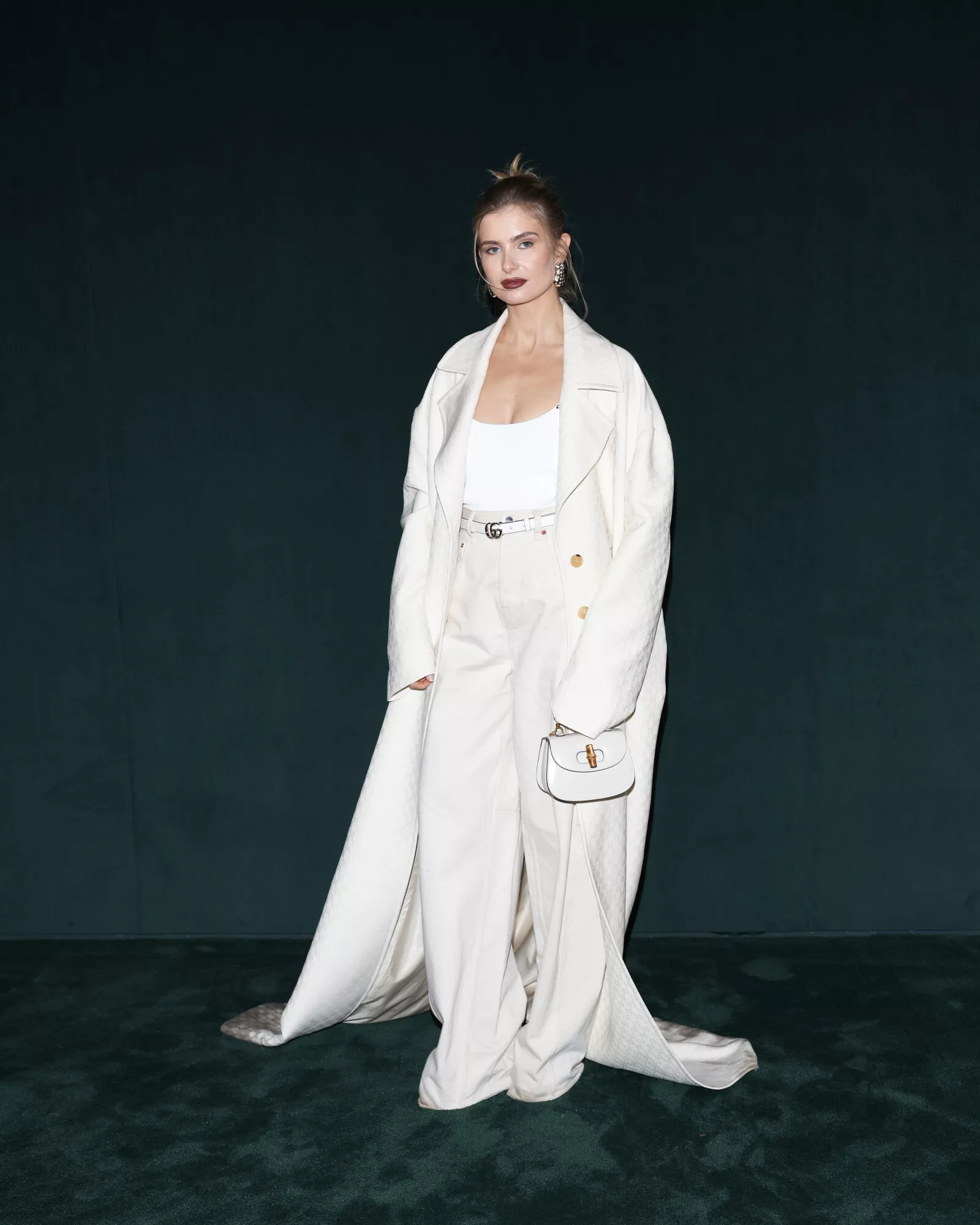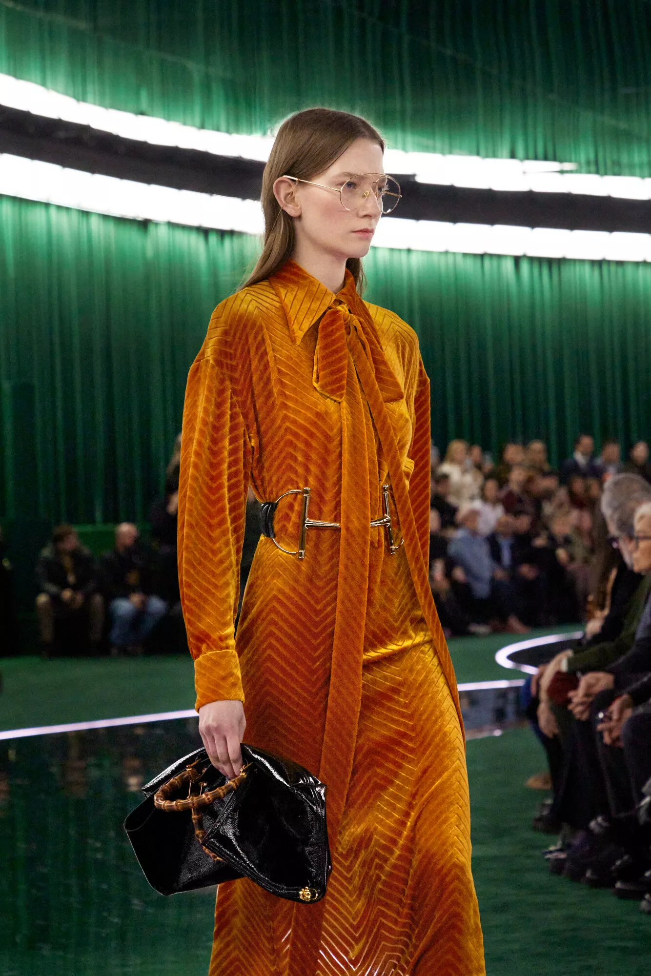 A synthesis of eras is embraced in terms of silhouette, from the late 1960s – the inception of Gucci ready-to-wear – traversing the decades since. Yet, in the amalgam from mid 1990s minimalism to the more recent ultra-maximal, Gucci motifs unite and the melange means something new. Unifying all is the Horsebit, perhaps the most recognizable of all Gucci motifs. It, too, celebrates an anniversary: seventy years of the Horsebit 1955 bag. From oversized to tiny, horsebits proliferate, a pop readymade appearing in jewelry, like in the flash of waist chain of a deep scooped back dress or most often on leather goods. From the classic Horsebit 1955 bag transformed through new, ultra-soft construction via the giant Horsebit handle of the new slouched shoulder bag to the precise, ultra-luxe construction of the new Gucci Siena, fastening with a half Horsebit click. At its most comfortable, the motif is at home on slippers.
