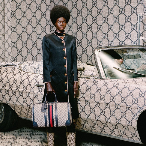 The blue GG canvas is revived through a dedicated campaign where the attention is focused entirely on the motif.. From the floor to the ceiling, everything featured within the setting is decked out in the signature pattern. The Gucci items blend with the backdrop, just defined by the blue leather trim and the blue-red-blue Web stripe.