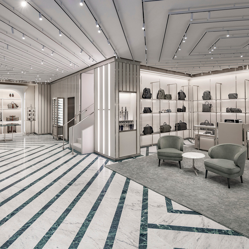Guests are warmly welcomed by the building’s green and white façade, distinguished by a mono-hued motif that elegantly frames the House’s logo. The design of the interiors is equally refined and references details from the House’s collections, as the dual-colored marble flooring echoes the façade through its discreet palette and geometric shapes. Soft rich fabrics in lighter tones adorn the walls, harmoniously complementing the ivory boiserie, which acts as a delicate backdrop to the items on display. The use of clean lines and an understated palette adds to the environment’s polished and subtle charm.