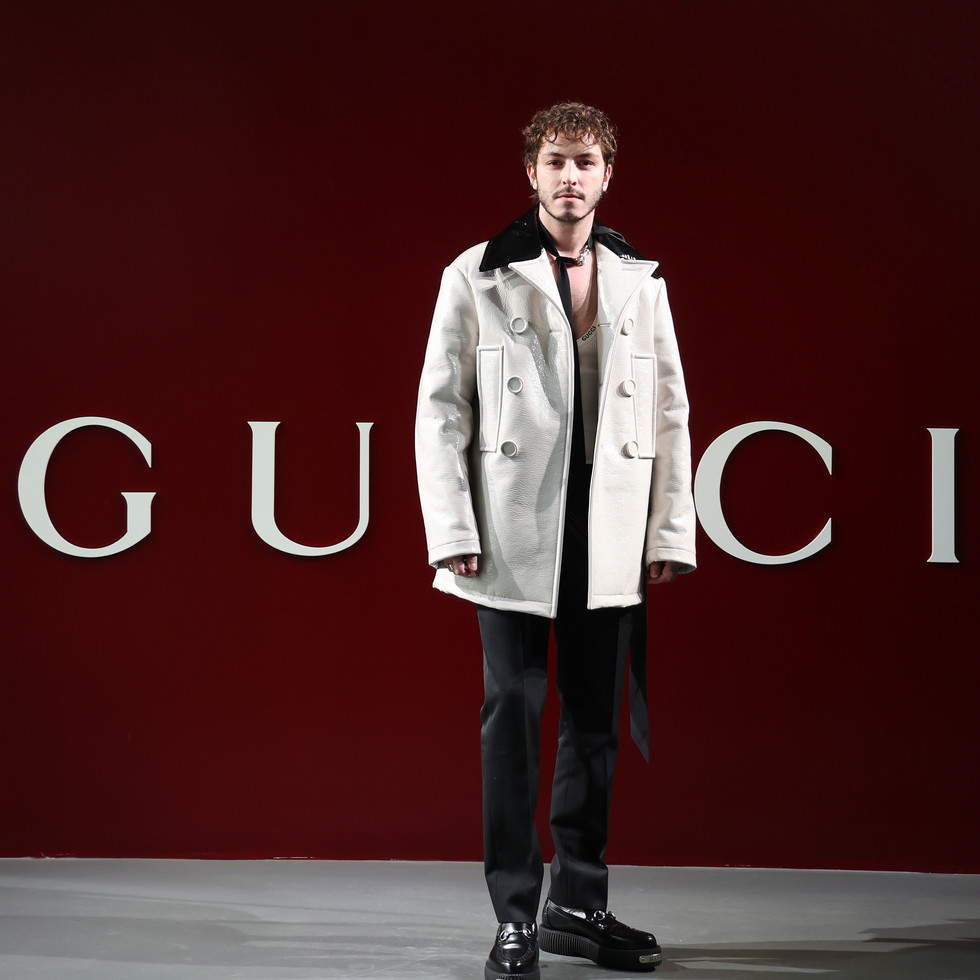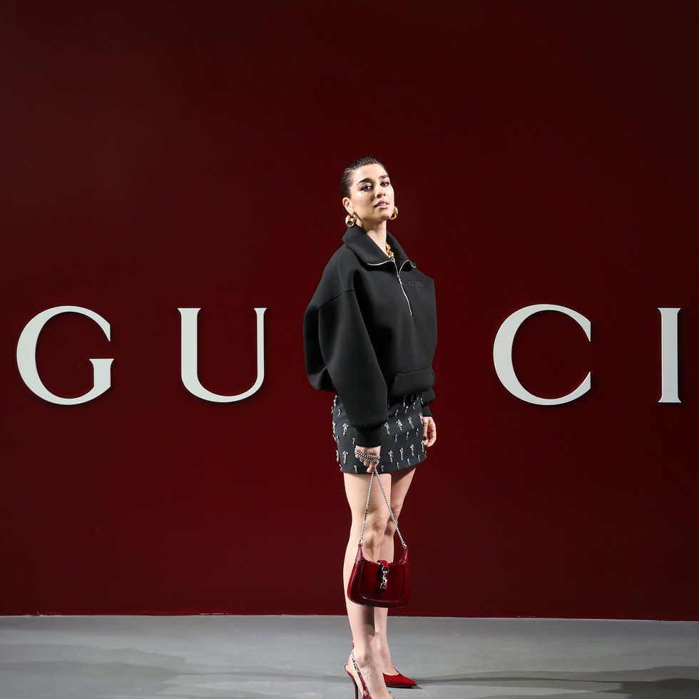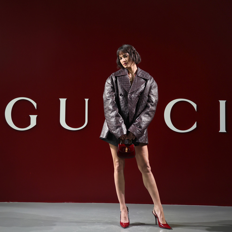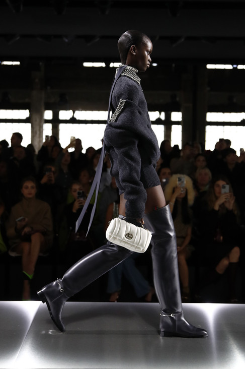 A new top handle bag with a flat and perforated logo that reveals what lies beneath, crafted in nappa with a naturally silky feel and paired with a layer that renders it light and puffy, called GG Milano. And then, a half-moon silhouette inspired by the equestrian motifs found in the Gucci Archive, infused with a contemporary spirit, is also decorated with a new logo. A clutch embellished and held together with a gold-toned metal bar that replicates the iconic bamboo. Finally, a Bamboo bucket bag with a broad and embracing silhouette.