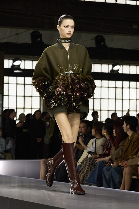 Lace, cut and reconstructed, is embellished with embroideries, other laces, or velvets. Shifts are a combination of overlapping layers, held together by laces. Jacquard prints depict a geometric heron, recognizable only up close. Knitwear is enriched by transparent or slightly off-tone sequins or with a crystal fringe that recreates a ribbed motif. Twin sets aren’t twin sets, but distinctive pieces. The colors - the ugly ones, the ones of the heart, and the wrong ones, together.
