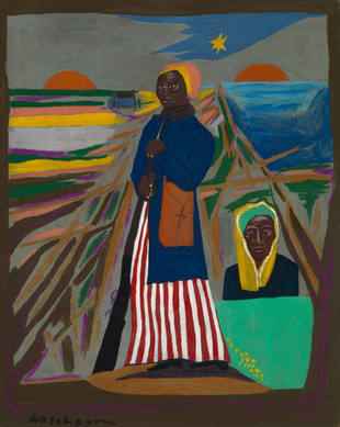 Rather than creating individual series featuring these fighters, as did Jacob Lawrence, a colleague who also taught at the Harlem Community Art Center, Johnson offered episodic vignettes that captured defining accomplishments, places, and sometimes multiple protagonists that told complete stories within a single image. Harriet Tubman, for example, shows the preeminent “conductor” of the Underground Railroad standing, rifle in hand, along a convergence of roads with the North Star bright above her head. At the lower right a bust-length portrait shows Tubman wrapped in the shawl presented to her by Queen Victoria.