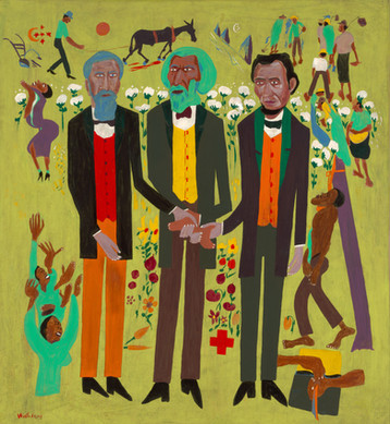 In Three Great Abolitionists, Abraham Lincoln, Frederick Douglass, and John Brown clasp hands in a yellow field with growing cotton, Gospel singers, a share cropper, and a lynched African American man. Marian Anderson is surrounded by flags and buildings representing cities around the world where she performed. In a small vignette at the center right, she shakes hands with Eleanor Roosevelt, who had arranged for Anderson to perform on the national mall, standing in front of the sculpture of Abraham Lincoln after the Daughters of the American Revolution cancelled her performance at Constitution Hall because she was black. Boxers frames Joe Louis between the cabin where he grew up and the army barracks where he served before beginning his reign as the world heavyweight champion from 1937 to 1949.
