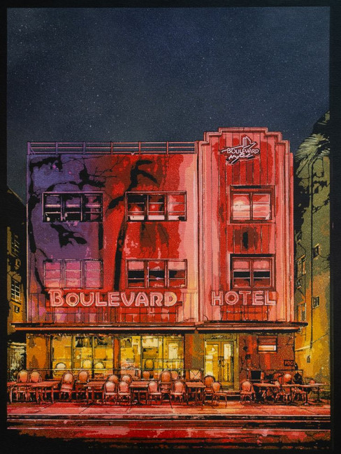 Capturing the liminal hours between dusk and dawn in Miami and New York, Nocturnal Edens reimagines cityscapes as living, breathing entities that pulse with light, shadow and memory. Hicks transforms familiar architecture into meditative dreamscapes, using neon glow and floral patterning to soften rigid lines and highlight the serenity that exists within the urban sprawl.
