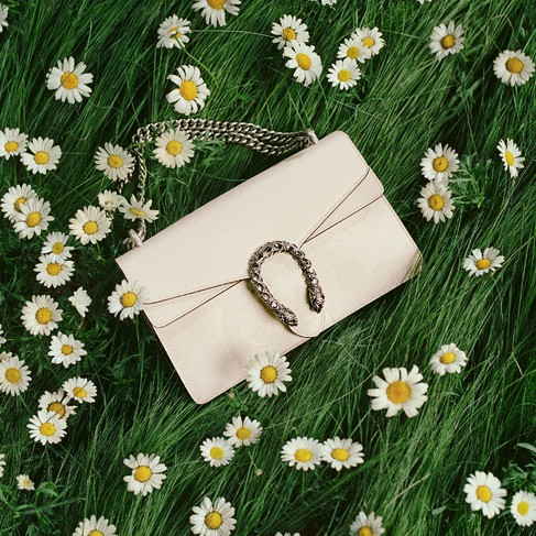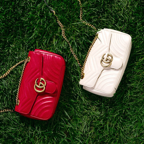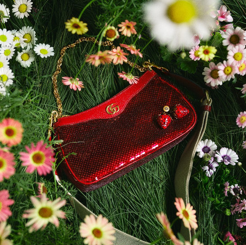 The campaign inspires novel renditions of the House’s signature handbags as the Gucci Diana, the Dionysus, and the GG Marmont lines, presented in bold tones and romantic patterns. The same motifs adorn a pair of Horsebit loafers, celebrating this style’s 70-years anniversary since first conceived by Aldo Gucci in 1953. Heart-shaped shoulder bags featuring the Interlocking G emblem are presented along a sparkly version of the Aphrodite shoulder bag offering an amusing, light-hearted take on the House’s accessories.