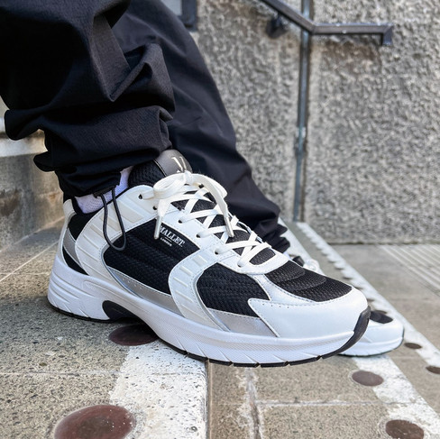 Crafted from off-white leather with black mesh and silver panel details, the retro running-inspired sneaker features Mallet’s signature logo in silver foil across the sides, as well as M logos on the tongues. For maximum comfort, the shoe sits on a springy soft white midsole with a black outsole tread.