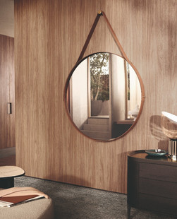 Elegant and precious, Drop is a generously sized round mirror. It features a leather frame that incorporates the strap used to hang it on the wall.