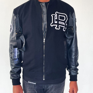 Evrice Cornelius: The jacket was designed as soft armor. The belting that is used was constructed in a way that when it's adjusted, it tends to collapse and cinch the body. This makes the aesthetic very versatile as the wearer can style it either buckled or unbuckled. While the chenille patches throughout gives you that bold graphical appearance, the main focal point is the ability to intertwine and reinvent a fashion staple. We created the bomber jacket as an art piece that can visually carry our brand DNA into future capsules.