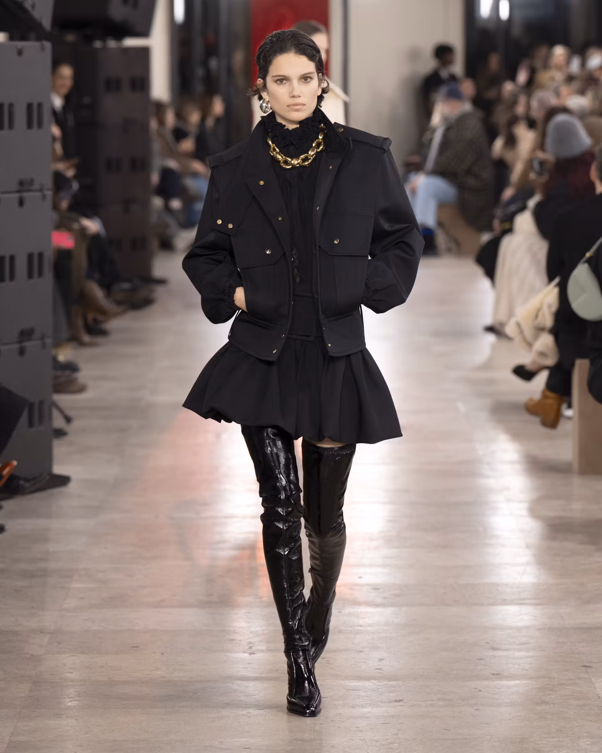 Hands in pockets, striding in high-shine boots, Patou silhouettes have a decidedly confident allure, replete with chain-link necklaces, gilded buttons and metallic fastenings against soft wool or glossy faux leather. Translucent floral motifs emphasize the curves of busts and leg lines.