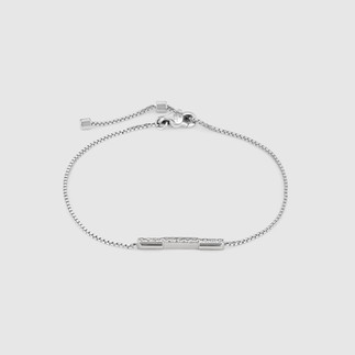The collection also includes fine necklaces, bracelets, and earrings, all featuring a small bar pendant displaying the GUCCI logo as a graphic detail. The necklaces with a delicate chain and a central bar pendant come in 18 kt yellow or pink gold, as well as in white gold with a diamond-set bar. A new addition, the Lariat necklace, which emphasizes the neckline in a refined way, comes in 18 kt yellow and pink gold, or white gold with diamonds, and loops around the neck without a clasp, fastening through a sliding circle element. The chain is finished with a bar pendant.