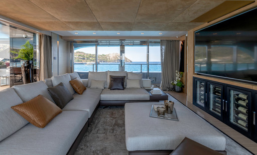 Indoor, the main saloon features refined and understated luxury interiors achieved by a combination of contemporary design furniture, elegant textiles, precious leathers and bespoke finishes for a tactile perception of timeless elegance.