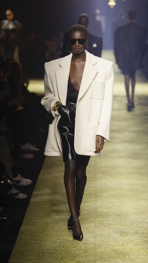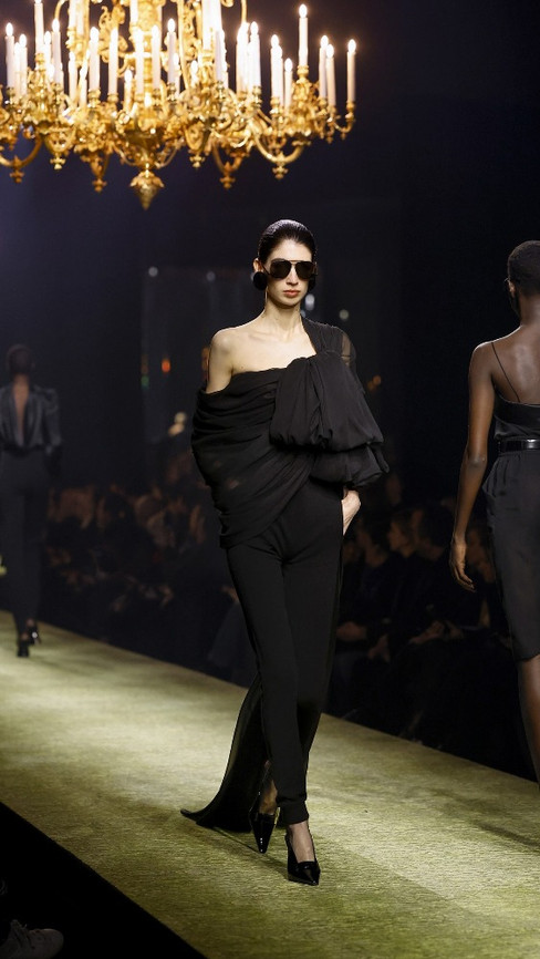 Anthony Vaccarello’s fall 2023 collection for Saint Laurent was all about elegance, expertly explored through taut tailoring and menswear fabrics. The look was centered on exaggerated shoulder jackets paired with lean skirts or cashmere leggings, with chiffon blouses and shawls adding a softer touch. The jackets were impressively constructed yet relatively light, while knit pieces added a sense of flexibility. Vaccarello’s evening offerings included diaphanous black lace and draped and wrapped tops. The result was a moment of triumph and epic proportions.