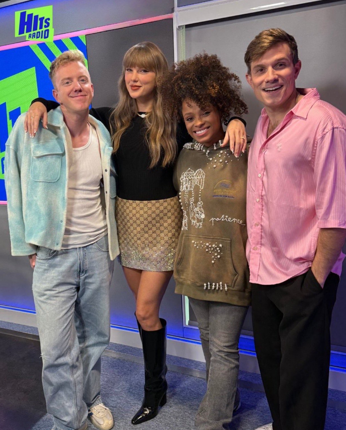 Taylor also wore a Gucci crystal appliqué embroidered GG canvas mini skirt while interviewed on Hits Radio Breakfast on October 3, 2025 in London, UK.