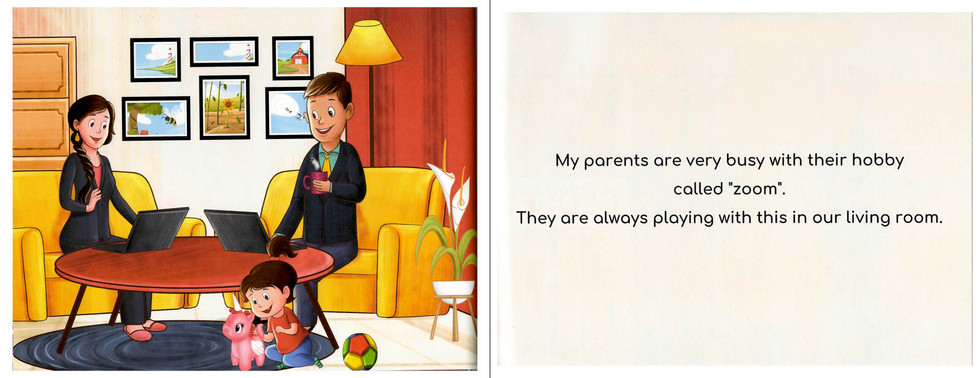 Each page of colorful animation by Rajib Mondal, comes with an opposite page of rhyming text as a first-hand deliberation from the mind of the child, as the fictitious daughter and parents experience each episode and circumstance induced by lockdown. To ensure a happy ending, the final reflection is the introduction of a vaccine that enables family life to resume back to normalcy.