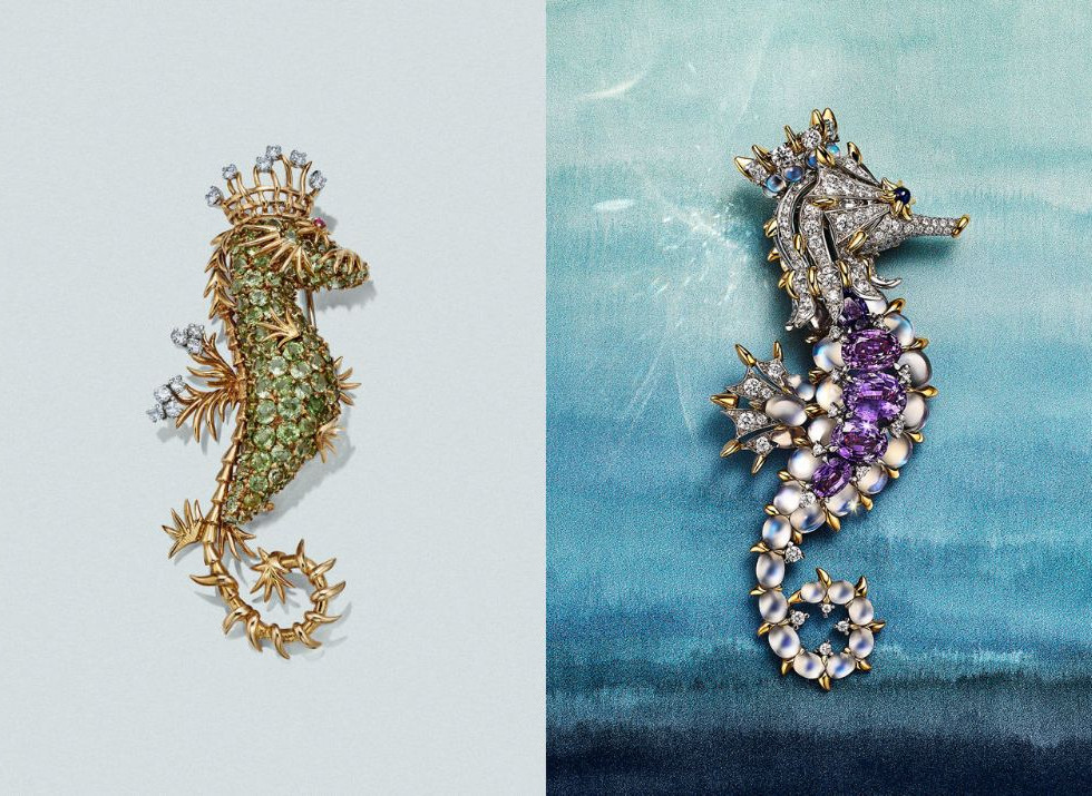 The collection features diamonds and rare colored gemstones arranged in sculptural designs that echo the sea’s colors and shapes. It draws on the legacy of Jean Schlumberger, Tiffany’s famed marine-inspired designer, but with a modern touch—platinum pieces resembling coral, swirling sapphires, opalescent tourmalines, and diamonds set like sea foam on gold.