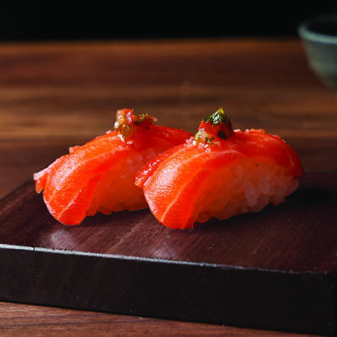 Ever seen someone take a look at a block of bright red tuna in a sushi case and say, “Man, that tuna looks so fresh!” There are five kinds of fish that Americans typically consume for sushi: tuna, salmon, yellowtail, eel, and a whitefish. You can buy any of those fish in a precut, preformed, preweighed block. You’ll notice the tuna is really red, and the salmon is really orange. That’s from the nitrates used to package the fish. Many sushi restaurants order that way because the fish is cheap and they don’t need skilled labor to make their sushi. Bottom line: If it doesn’t look natural, it probably isn’t.