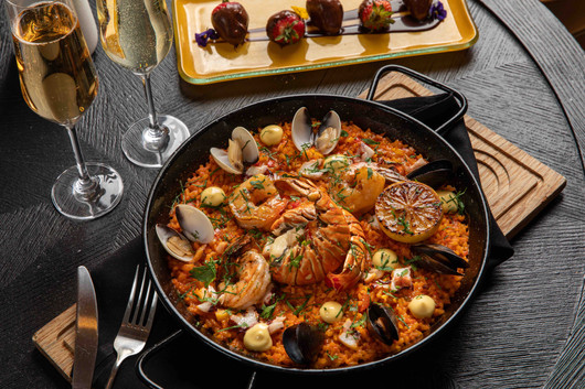 Seafood Paella: Local Seafood Calasparra, Bomba Rice, Paella cooked in Lobster Broth and Saffron